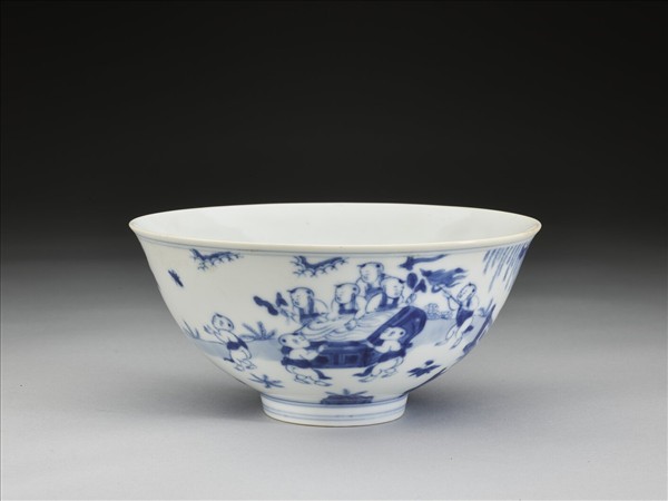 侈口窄唇,深壁,矮圈足。碗內樸素無紋飾,碗外壁繪夏日庭院嬰戲圖,襯以圍欄、樹石、花卉、雲層。十五孩童分隔成二組畫面,一組穿肚兜赤膊,一組穿衫褲。孩童頭部只以青料線勾繪無渲染。口足加飾青線六道。底有青花書「大明成化年製」六字二行楷款,外加雙圈。