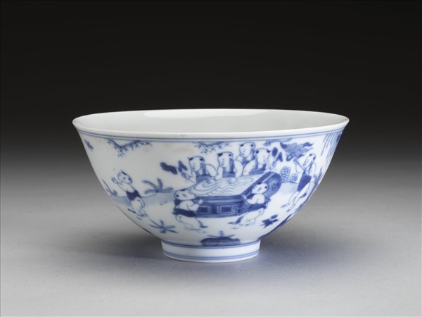 侈口窄唇,深壁,矮圈足。碗內樸素無紋飾,碗外壁繪夏日庭院嬰戲圖,襯以圍欄、樹石、花卉、雲層。十五孩童分隔成二組畫面,一組穿肚兜赤膊,一組穿衫褲。孩童頭部只以青料線勾繪無渲染。口足加飾青線六道。底有青花書「大明成化年製」六字二行楷款,外加雙圈。