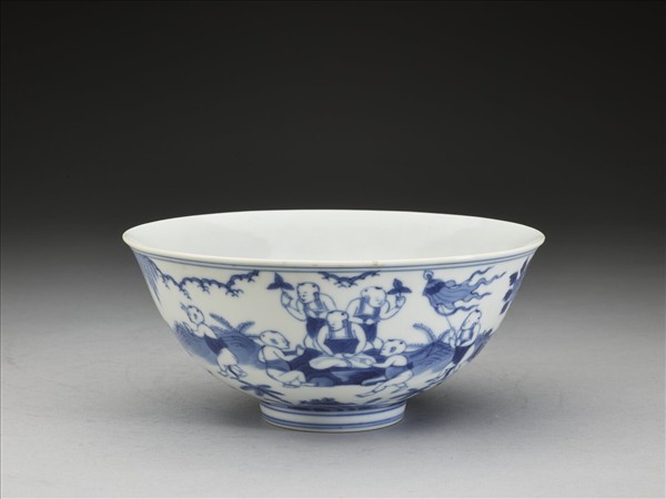 侈口窄唇,深壁,矮圈足。碗內樸素無紋飾,碗外壁繪夏日庭院嬰戲圖,襯以圍欄、樹石、花卉、雲層。十四孩童分隔成二組畫面,一組穿肚兜赤膊,一組穿衫褲。孩童頭部只以青料線勾繪無渲染。口足加飾青線六道。底有青花書「大明成化年製」六字二行楷款,外加雙圈。
