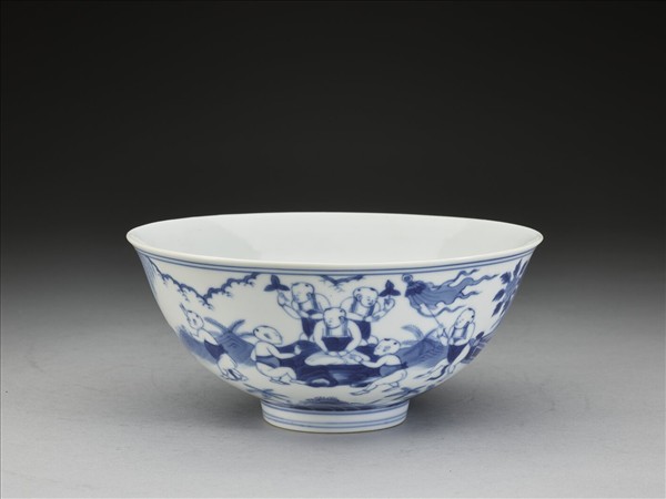 侈口窄唇,深壁,矮圈足。碗內樸素無紋飾,碗外壁繪夏日庭院嬰戲圖,襯以圍欄、樹石、花卉、雲層。十四孩童分隔成二組畫面,一組穿肚兜赤膊,一組穿衫褲。孩童頭部只以青料線勾繪無渲染。口足加飾青線六道。底有青花書「大明成化年製」六字二行楷款,外加雙圈。