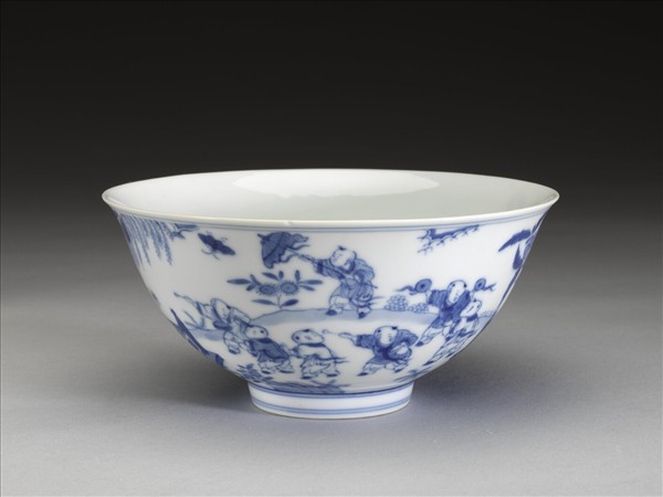 侈口窄唇,深壁,矮圈足。碗內樸素無紋飾,碗外壁繪夏日庭院嬰戲圖,襯以圍欄、樹石、花卉、雲層。十五孩童分隔成二組畫面,一組穿肚兜赤膊,一組穿衫褲。孩童頭部只以青料線勾繪無渲染。口足加飾青線六道。底有青花書「大明成化年製」六字二行楷款,外加雙圈。
