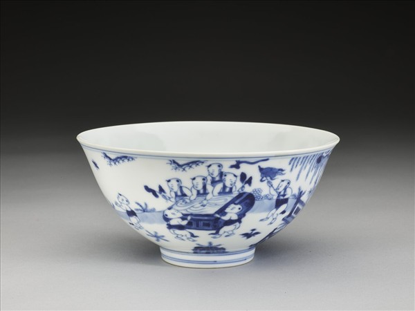 侈口窄唇,深壁,矮圈足。碗內樸素無紋飾,碗外壁繪夏日庭院嬰戲圖,襯以圍欄、樹石、花卉、雲層。十五孩童分隔成二組畫面,一組穿肚兜赤膊,一組穿衫褲。孩童頭部只以青料線勾繪無渲染。口足加飾青線六道。底有青花書「大明成化年製」六字二行楷款,外加雙圈。