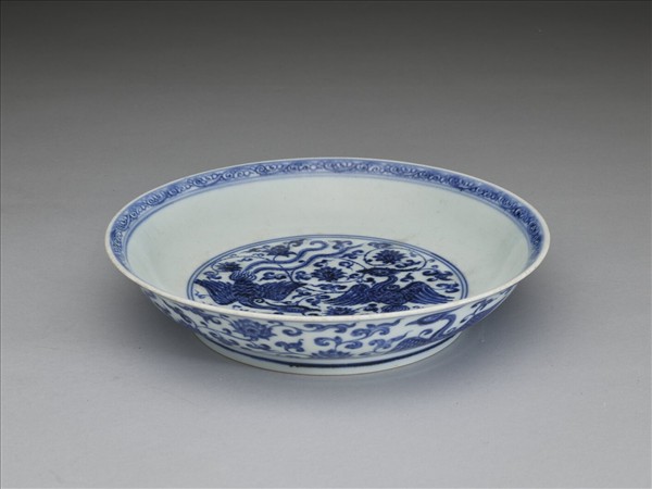 侈口窄唇,淺壁弧形,矮圈足。內面口沿下畫勾雲紋一周,盤心與外壁各畫鳳凰一對,隙地滿飾纏枝番蓮花,內外分飾青線八道。內壁純白,樸素無紋飾。