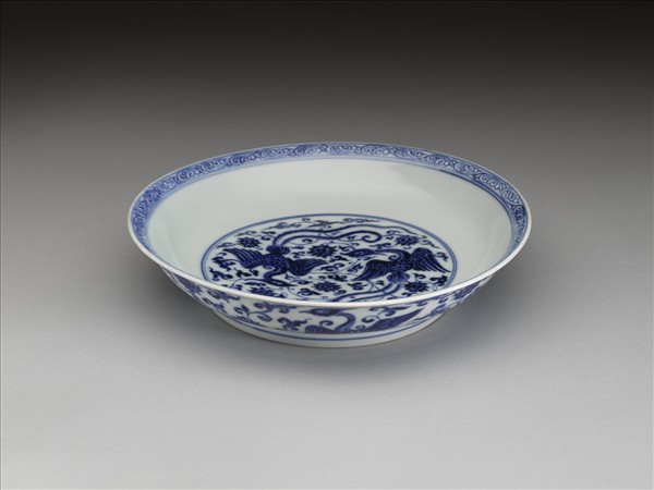 侈口窄唇,淺壁弧形,矮圈足。內面口沿下畫勾雲紋一周,盤心與外壁各畫鳳凰一對,隙地滿飾纏枝番蓮花,內外分飾青線八道。內壁純白,樸素無紋飾。