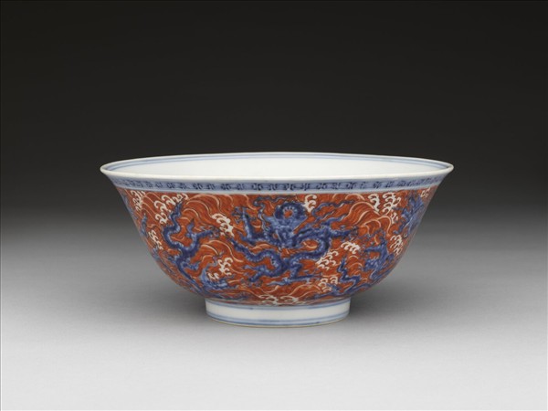 青花描紅波濤龍紋碗