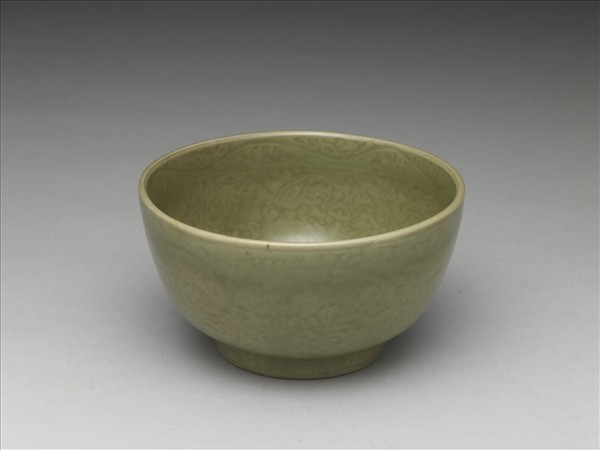 墩子碗,直口、深腹、圈足。內外壁均陰線刻花。線條纖細軟弱。器裡口緣轉枝卷葉紋一周,內壁轉枝番蓮紋,主花八朵;內底為剔地拱花番蓮紋一枝,圍以雙線圈。外壁為轉枝番蓮紋,六朵主花。圈足壁刻回紋。足圈滿釉,器底環形無釉墊燒區。釉汁瑩亮,紋飾輕淺難辨。