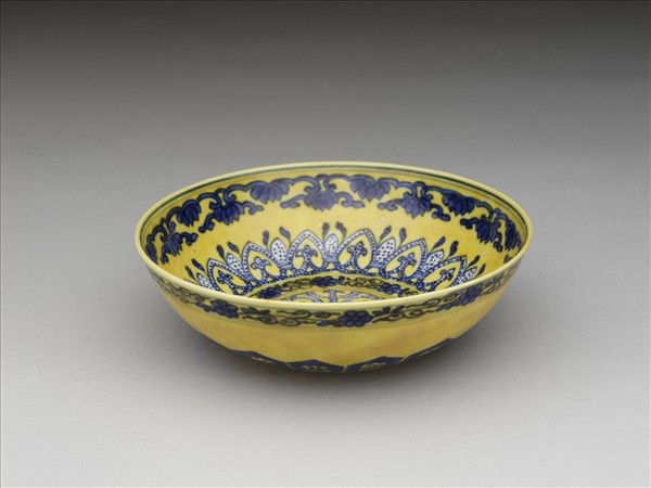 敞口窄唇,深壁弧形,凸底,矮圈足。內壁畫花卉及桃形圖案各一周,碗心畫四連桃形圖案一枚,外飾纏枝花卉紋一周。外壁口沿下畫纏枝花卉一道,周壁畫蓮瓣紋,內飾梅花,底邊回紋一道。內外分畫青線九道。原為白地青花,加施黃釉一層。