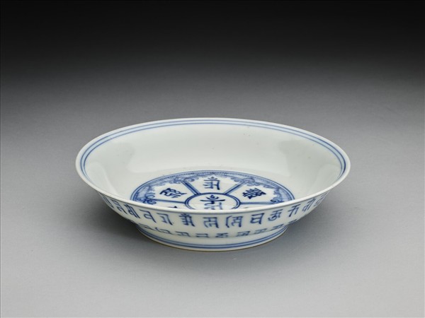 侈口,淺壁,矮圈足。薄胎白釉。盤心畫蓮瓣紋,加書青花梵文七字,內壁純白無紋飾。外壁書梵文二層。內外口沿及足邊加飾青線十道。