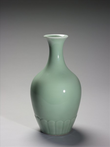 瓶,撇口,長頸,斜肩,上豐下斂腹,近底處飾有菊瓣紋一圈。施青釉,釉色潔淨高雅。足露白胎,外底心書「大清雍正年製」青花篆書款。根據明高濂《遵生八牋.瓶花三說》敘述,宋代官、哥等青瓷及白瓷為文人擇瓶的首選,而這類「肚大下實者…需折斜冗花枝,鋪撒左右。」高濂描繪的花型,在清代持續出現。例如晚清時期吳璋畫〈百事如意軸〉(故畫02907),碩腹的青瓷瓶內梅枝斜冗,白色茶花成不等邊三角型高低錯落插置,水仙花葉襯底盤。瓶花周邊置放柿子、百合、如意,表達「事事如意」的吉祥諧音。類似的青瓷瓶器也用來插草本植物,〈清畫院十二月月令圖五月〉(故畫003110),圖中菖蒲直立高聳而出,紅色的茶花、萱草花葉斜冗而出,兩者皆是以明晚期文人高濂所描繪的標準花型進行插作。