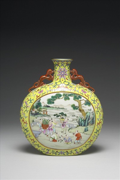 扁圓形,撇口,扁圓腹,帶雙夔耳,臥足。口沿繪如意雲紋,雙耳為磚紅地金彩夔龍紋,開光隙地繪黃地卷枝四季花卉紋,開光上方繪一蝙蝠,瓶側繪磬。腹部中心開光,一面繪童戲圖,一面為白地墨書御製詩 :「平台文石淨無塵,小立凝眸景物新,春到心間饒富麗,椏煙花雨總空心,遲遲春日上迴廊,庭院深沉午晝長,徙倚東風不歸去,撩心芬氣撲衣裳,珮環聲響出簾帷,結隊雙雙蓮步遲,紅紫隔垣紛潑眼,臨風小眼立移時,望裏重重綺倫疏,閒庭風暖午晴初,能言鸚鵡窺心語,報道春寒已盡除。」及「乾隆」、「宸翰」朱白雙印。底施湖綠釉,白地紅書「大清乾隆年製」六字三行篆款。