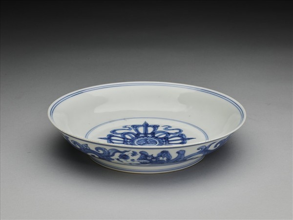 侈口,淺壁,矮圈足。薄胎白釉。盤心畫十字杵圖紋,內壁純白無紋飾。外壁畫夔龍四條,口啣蓮花。內外口沿及足邊加飾青線十道。