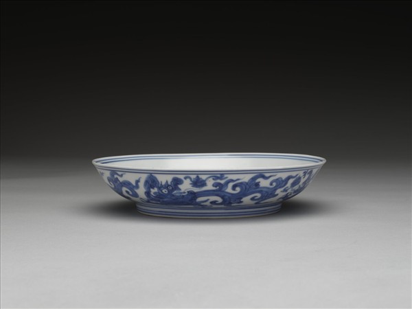 侈口,淺壁,矮圈足。薄胎白釉。盤心畫十字杵圖紋,內壁純白無紋飾。外壁畫夔龍四條,口啣蓮花。內外口沿及足邊加飾青線十道。