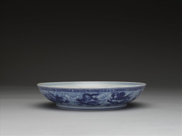 侈口,淺壁,矮圈足。胎質稍厚。盤心畫青龍一條,內壁純白無紋飾。外口沿下畫古錢紋一周,外壁畫青龍九條,隙地滿畫波濤紋。內外口沿及足邊加飾青線九道。