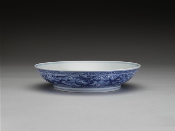 侈口,淺壁,矮圈足。胎質稍厚。盤心畫青龍一條,內壁純白無紋飾。外口沿下畫古錢紋一周,外壁畫青龍九條,隙地滿畫波濤紋。內外口沿及足邊加飾青線九道。
