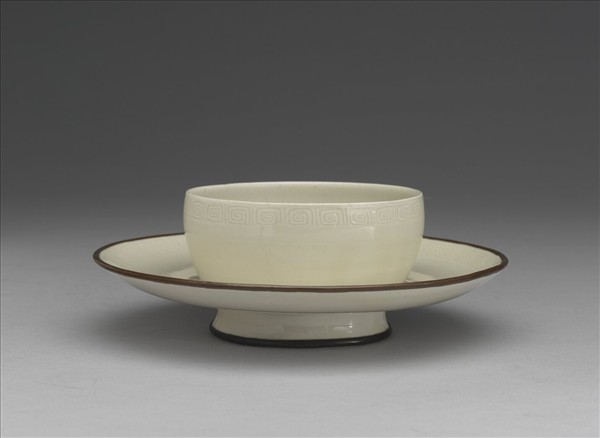 典型宋代茶托形制「形如碗帶盤,中空,下有足。」此定窯茶托上方深腹碗形為茶盞托圈,壁深用以承盞,中空無底;盤口及圈足均鑲銅扣,圈口無釉未加圈扣。托盤寬圓平出微上撇,圈足略高外撇,圈口及盤口皆刻劃回紋一周為飾,釉色牙白瑩潤,胎質細膩。 南宋末周密《齊東野語》書內曾提及宋人舉茶是茶盞與茶托一起,足見茶托與茶盞配套使用,遼宋壁畫或茶畫上所繪茶盞與茶托,一般都是成組出現,形影不離,舉茶時可隻手扣持盤沿,隻手持盞。此於南宋周季常、林庭珪所繪〈五百羅漢圖〉(1178-1188),或1959年出土的金代山西孝義縣張家莊金墓〈磚雕仕女圖〉上皆可見及宋人持盞方式。 宋代定窯燒造數量極大,除精品上貢外,一般民間日常用器亦有生產,碗盤類最為常見,茶托存世較少,可能是宮廷訂製器皿。北宋早期還見托圈有底,如定州靜志寺塔基出土帶「官」字款茶托,形為宋制,但有底,不中空,可視為唐五代至宋代過渡時期製品。宋代中期以後托多為中空,汝窯、官窯、景德鎮青白瓷等或漆器、金銀器皆然。黑漆茶托搭配白釉茶盞或朱漆茶托與黑釉茶盞成套,形成黑白、或紅黑對比的時尚美感,而《齊東野語》內則提及家中有喪則不宜舉用朱色茶托。