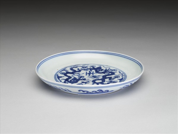 侈口窄唇,淺壁,矮圈足。盤心畫雲龍二條,外壁畫雲紋八朵,內外加飾青線七道。底有青花書「大明嘉靖年製」二行六字楷款,外加雙圈。