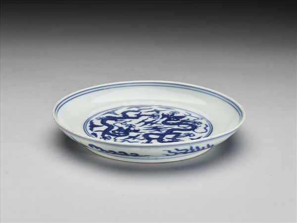 侈口窄唇,淺壁,矮圈足。盤心畫雲龍二條,外壁畫雲紋八朵,內外加飾青線七道。底有青花書「大明嘉靖年製」二行六字楷款,外加雙圈。