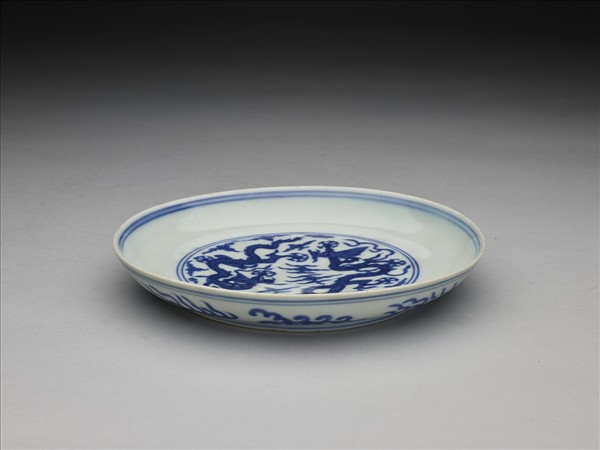 侈口窄唇,淺壁,矮圈足。盤心畫雲龍二條,外壁畫雲紋八朵,內外加飾青線七道。底有青花書「大明嘉靖年製」二行六字楷款,外加雙圈。