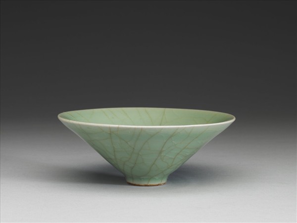 敞口,器壁斜高,圈足淺而小,底心微凸起。全器除底足外,均施青釉,器面滿佈淺褐色及白色開片紋。口沿釉薄處顯灰白胎色,外口沿及器心積釉較厚,呈湖綠色。胎骨堅薄,足底塗褐色護胎汁,未及處露灰白胎。碗形造型為典型宋代點茶茶盞,此類茶盞的口徑與足徑比例相差甚大,故而重心不甚平穩,因此必須配置茶托,此或為宋人茶盞多置於托上的主因之一。