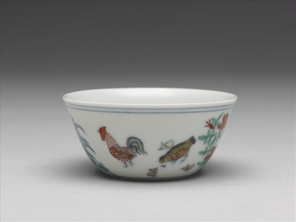 侈口,矮壁,平底,凹足。外壁彩繪湖石花卉間散佈二組雞群,各為雌雄二雞分帶三雛雞,花卉湖石均以釉下青花圖繪勾勒,再填紅、黃、綠、褐諸色。成雞以實筆或虛線勾勒,並多重上彩染繪。雛雞線條則清描淡繪,僅填嫩黃一色。口沿及底邊分畫青線三道。內面素白無紋。底書青花「大明成化年製」雙方框六字楷款。