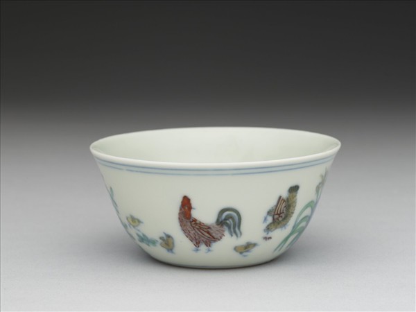 侈口,矮壁,平底,凹足。外壁彩繪湖石花卉間散佈二組雞群,各為雌雄二雞分帶三雛雞,花卉湖石均以釉下青花圖繪勾勒,再填紅、黃、綠、褐諸色。成雞以實筆或虛線勾勒,並多重上彩染繪。雛雞線條則清描淡繪,僅填嫩黃一色。口沿及底邊分畫青線三道。內面素白無紋。底書青花「大明成化年製」雙方框六字楷款。
