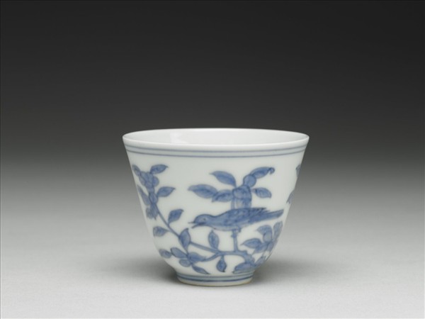 侈口,深壁,圈足。杯外壁青花繪飾花果二株,各棲一鳥。杯內素白無紋。口足各飾青線二道。底青花書「大明成化年製」雙圈六字楷款。