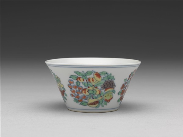 杯,侈口,斜壁,凹足。外壁彩繪四季花卉、果實二團,口足飾青線三道。杯內素白無紋。花果均以釉下青花勾勒輪廓,再填以紅、黃、綠、紫諸彩。底書青花「大明成化年製」雙方框六字楷款。