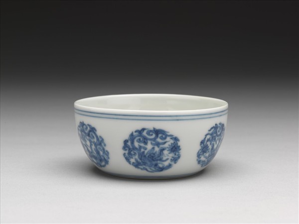 斂口杯,周壁弧形,圈足。外壁以釉下鈷藍畫團夔龍啣蓮六條,各銜蓮花一枝,口足各飾青線二道。內面純白,樸素無紋飾。底有青花書「大明成化年製」六楷字款,外加雙方框。