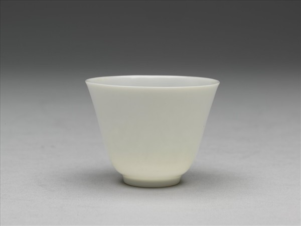 侈口杯,深弧壁,圈足。內壁錐拱雙龍戲珠紋。甜白釉,半脫胎,故又外壁可映見龍紋。足緣露胎一圈,底外青花書「大明成化年製」雙行六字楷款,外加雙圈。