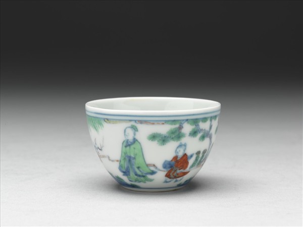 斂口,深壁,凹足。外壁彩畫二組人物,均以釉下青花描邊,再填以紅、黃、綠、赭、綠諸彩。一組紅衣高士及綠衣童子在柳樹下,閒坐觀鵝,一組為綠衣高士、紅衣童子攜琴步於松樹、菊花間,口足分飾青線三道。內面素白無紋。底書有青花「大明成化年製」雙方框六字楷款。