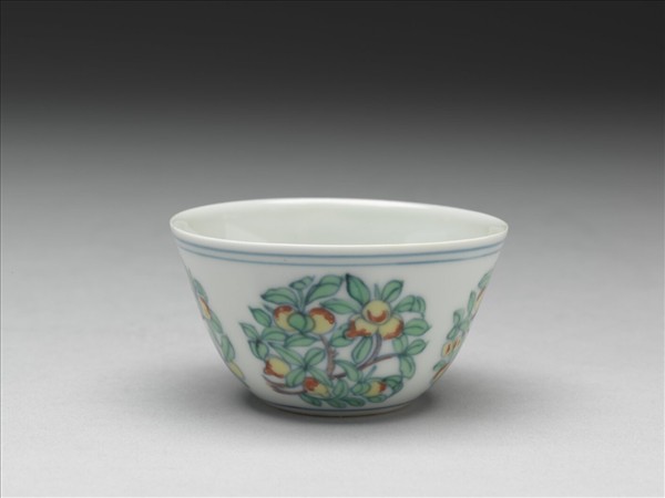 侈口,圓口、弧形壁、圈足。外壁彩繪團果四叢,口緣及圈足各有青線一道。團果枝葉以青料繪輪廓,色澤較淡,內填繪綠、黃、紅、紫、褐彩。器內素白無紋。無使用痕跡。底書青花雙方框「大明成化年製」楷體六字款。