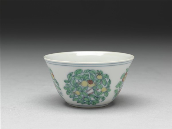 侈口、弧形壁、圈足。外壁彩繪團果四叢,口緣及圈足各有青線一道。團果枝葉以青料繪輪廓,色澤較淡,內填繪綠、黃、紅、紫、褐彩。器內素白無紋。無使用痕跡。底書青花雙方框「大明成化年製」楷體六字款。