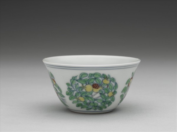 侈口、弧形壁、圈足。外壁彩繪團果四叢,口緣及圈足各有青線一道。團果枝葉以青料繪輪廓,色澤較淡,內填繪綠、黃、紅、紫、褐彩。器內素白無紋。無使用痕跡。底書青花雙方框「大明成化年製」楷體六字款。