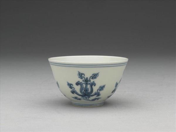 侈口,深壁,圈足。杯外壁青花繪飾四朵折枝番蓮花,杯內素白無紋。口足各飾青線二道。底青花書「大明成化年製」雙圈六字楷款。