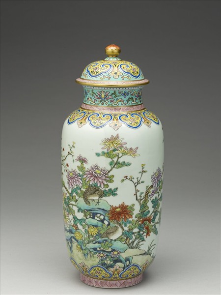 斂口,短頸,長腹,矮圈足,帶蓋。腹部白釉地,彩畫各色菊花、鵪鶉,寓意「安居」。間飾湖石、花草。口、足皆施黃綠釉,彩畫番蓮、回紋及如意雲。器內及底各施湖綠色釉。底紅料書「大清乾隆年製」,六字篆款,外加單方框。