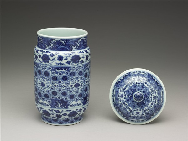 斂口,短頸,長腹,矮圈足,帶圓頂蓋。胎質較厚,通體白釉。頸上青花書波濤紋。腹部中段畫錦格紋,加畫番蓮、波濤等紋飾,上下分畫纏枝番蓮花。足畫雲頭紋,加飾花瓣。蓋面滿畫錦格紋,加畫番蓮波濤等紋飾。