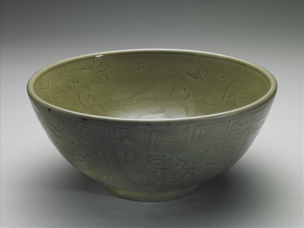 大碗,敞口,弧形壁、圈足。內外壁均劃花裝飾,外口緣回紋一周,腹為轉枝花卉,布置勻稱;內壁亦劃轉枝花卉,線條迅捷躍動;內底心周圍微凹一圈,印折枝花卉一叢,隙地隱約有印文「王」(或「玉」)字。圈足內壁及底作大片寬璧狀無釉呈朱色,其間有窯具較窄的環形墊燒痕;足端於燒成後刻意磨去一圈無釉。全器釉色偏黃而沉著。全器劃刻線條熟練,外壁花紋尚稱工整,用刀沈穩,與宣德銘鳳尾瓶相類;內壁劃刻紋線圓轉曲繞,花葉零碎點佈,有元代風。