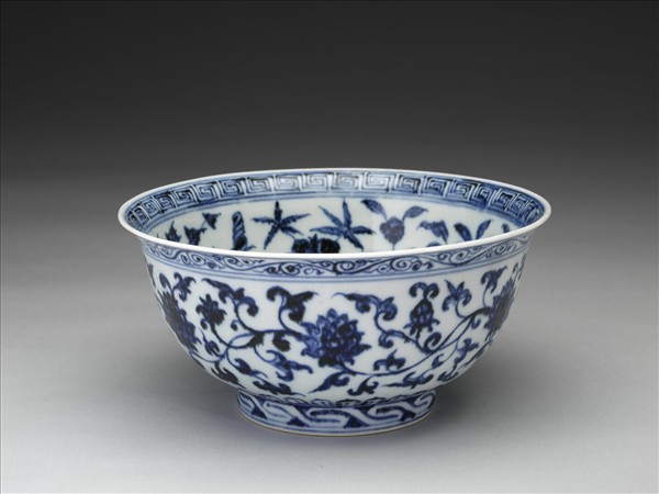 侈口窄唇,深壁,矮圈足。薄胎白釉。碗內口唇上畫回紋一週,內壁畫轉枝牡丹、菊花等六朵,碗心畫牡丹一枝。外面口沿下畫卷草紋,週壁畫纏枝番蓮六朵,底邊畫蓮瓣紋,足圈畫回紋,內外花紋間加飾青線十二道。
