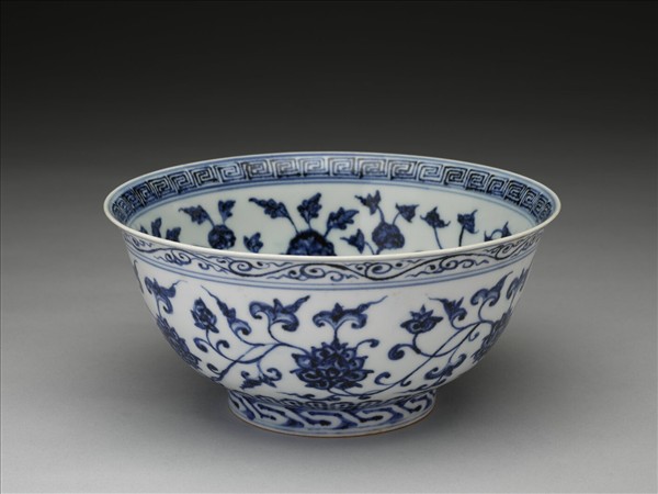 侈口窄唇,深壁,矮圈足。薄胎白釉。碗內口唇上畫回紋一週,內壁畫轉枝牡丹、菊花等六朵,碗心畫牡丹一枝。外面口沿下畫卷草紋,週壁畫纏枝番蓮六朵,底邊畫蓮瓣紋,足圈畫回紋,內外花紋間加飾青線十二道。