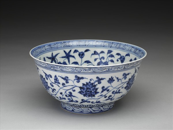 侈口窄唇,深壁,矮圈足。薄胎白釉。碗內口唇上畫回紋一週,內壁畫轉枝牡丹、菊花等六朵,碗心畫牡丹一枝。外面口沿下畫卷草紋,週壁畫纏枝番蓮六朵,底邊畫蓮瓣紋,足圈畫回紋,內外花紋間加飾青線十二道。