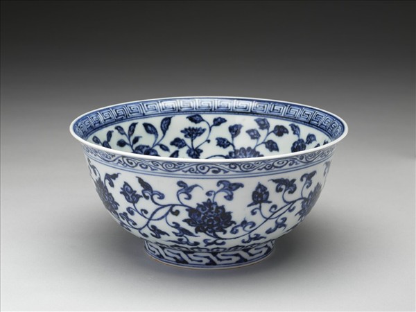 侈口窄唇,深壁,矮圈足。薄胎白釉。碗內口唇上畫回紋一週,內壁畫轉枝牡丹、菊花等六朵,碗心畫牡丹一枝。外面口沿下畫卷草紋,週壁畫纏枝番蓮六朵,底邊畫蓮瓣紋,足圈畫回紋,內外花紋間加飾青線十二道。