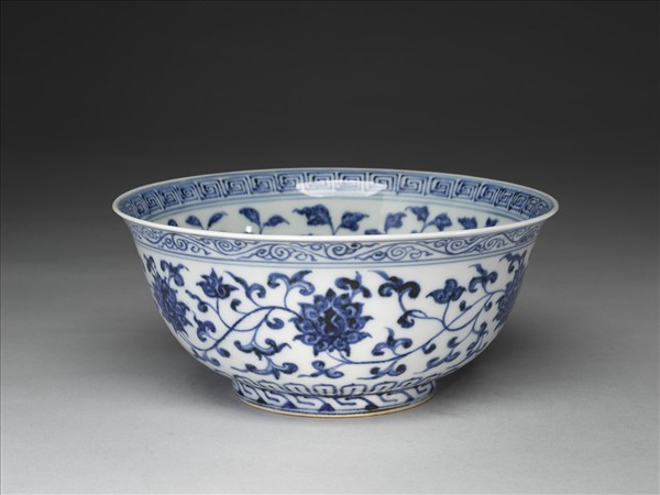 侈口窄唇,深壁,矮圈足。薄胎白釉。碗內口唇上畫回紋一週,內壁畫轉枝牡丹、菊花等六朵,碗心畫牡丹一枝。外面口沿下畫卷草紋,週壁畫纏枝番蓮六朵,底邊畫蓮瓣紋,足圈畫回紋,內外花紋間加飾青線十二道。