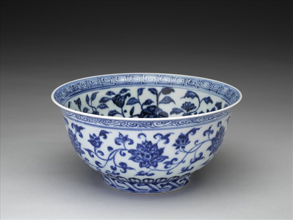 侈口窄唇,深壁,矮圈足。薄胎白釉。碗內口唇上畫回紋一週,內壁畫轉枝牡丹、菊花等六朵,碗心畫牡丹一枝。外面口沿下畫卷草紋,週壁畫纏枝番蓮六朵,底邊畫蓮瓣紋,足圈畫回紋,內外花紋間加飾青線十二道。