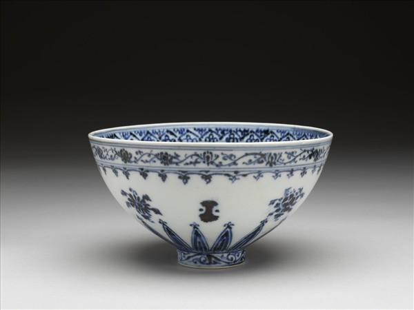 敞口,深壁上豐下斂,尖底,矮圈足,俗稱「蓮子碗」。內口沿下畫尖角花瓣紋一周,上下加飾雙線,周壁畫纏枝花卉,碗心畫四瓣花一朵,邊飾雙線二道及桃形勾連圖案一周。外口沿下畫轉枝小花,上下加飾雙線,周壁畫折枝四季花,間飾銀錠、珊瑚等四種,底邊飾菊瓣紋,足飾勾雲一周,青線三道。