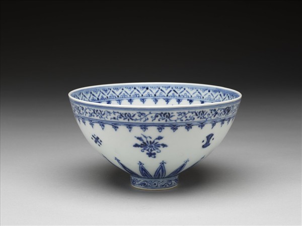 敞口,深壁上豐下斂,尖底,矮圈足,俗稱「蓮子碗」。內口沿下畫尖角花瓣紋一周,上下加飾雙線,周壁畫纏枝花卉,碗心畫四瓣花一朵,邊飾雙線二道及桃形勾連圖案一周。外口沿下畫轉枝小花,上下加飾雙線,周壁畫折枝四季花,間飾銀錠、珊瑚等四種,底邊飾菊瓣紋,足飾勾雲一周,青線三道。