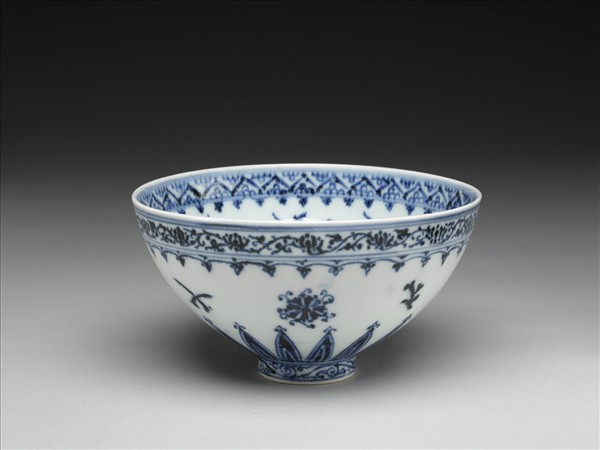 敞口,深壁上豐下斂,尖底,矮圈足,俗稱「蓮子碗」。內口沿下畫尖角花瓣紋一周,上下加飾雙線,周壁畫纏枝花卉,碗心畫四瓣花一朵,邊飾雙線二道及桃形勾連圖案一周。外口沿下畫轉枝小花,上下加飾雙線,周壁畫折枝四季花,間飾銀錠、珊瑚等四種,底邊飾菊瓣紋,足飾勾雲一周,青線三道。