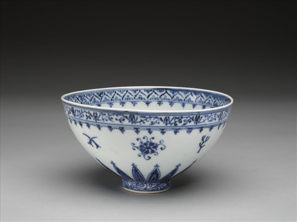 敞口,深壁上豐下斂,尖底,矮圈足,俗稱「蓮子碗」。內口沿下畫尖角花瓣紋一周,上下加飾雙線,周壁畫纏枝花卉,碗心畫四瓣花一朵,邊飾雙線二道及桃形勾連圖案一周。外口沿下畫轉枝小花,上下加飾雙線,周壁畫折枝四季花,間飾銀錠、珊瑚等四種,底邊飾菊瓣紋,足飾勾雲一周,青線三道。