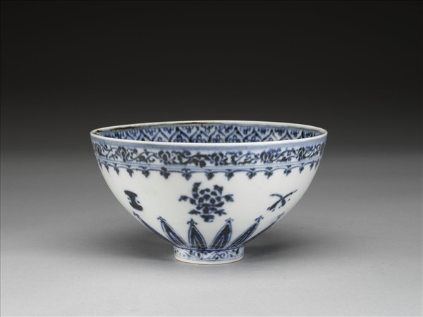 敞口,深壁上豐下斂,尖底,矮圈足,俗稱「蓮子碗」。內口沿下畫尖角花瓣紋一周,上下加飾雙線,周壁畫纏枝花卉,碗心畫四瓣花一朵,邊飾雙線二道及桃形勾連圖案一周。外口沿下畫轉枝小花,上下加飾雙線,周壁畫折枝四季花,間飾銀錠、珊瑚等四種,底邊飾菊瓣紋,足飾勾雲一周,青線三道。