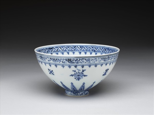 敞口,深壁上豐下斂,尖底,矮圈足,俗稱「蓮子碗」。內口沿下畫尖角花瓣紋一周,上下加飾雙線,周壁畫纏枝花卉,碗心畫四瓣花一朵,邊飾雙線二道及桃形勾連圖案一周。外口沿下畫轉枝小花,上下加飾雙線,周壁畫折枝四季花,間飾銀錠、珊瑚等四種,底邊飾菊瓣紋,足飾勾雲一周,青線三道。