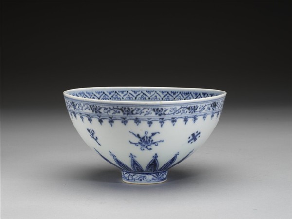 敞口,深壁上豐下斂,尖底,矮圈足,俗稱「蓮子碗」。內口沿下畫尖角花瓣紋一周,上下加飾雙線,周壁畫纏枝花卉,碗心畫四瓣花一朵,邊飾雙線二道及桃形勾連圖案一周。外口沿下畫轉枝小花,上下加飾雙線,周壁畫折枝四季花,間飾銀錠、珊瑚等四種,底邊飾菊瓣紋,足飾勾雲一周,青線三道。